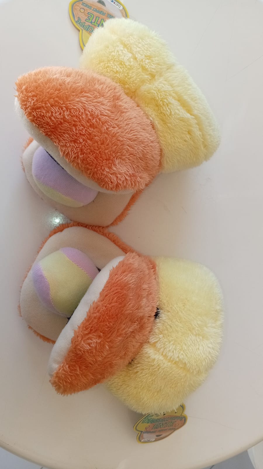 Género soft, con velcro, resistente y lavable. Contiene set de 2 guantes en diseño de pato, cada uno con una pelota.