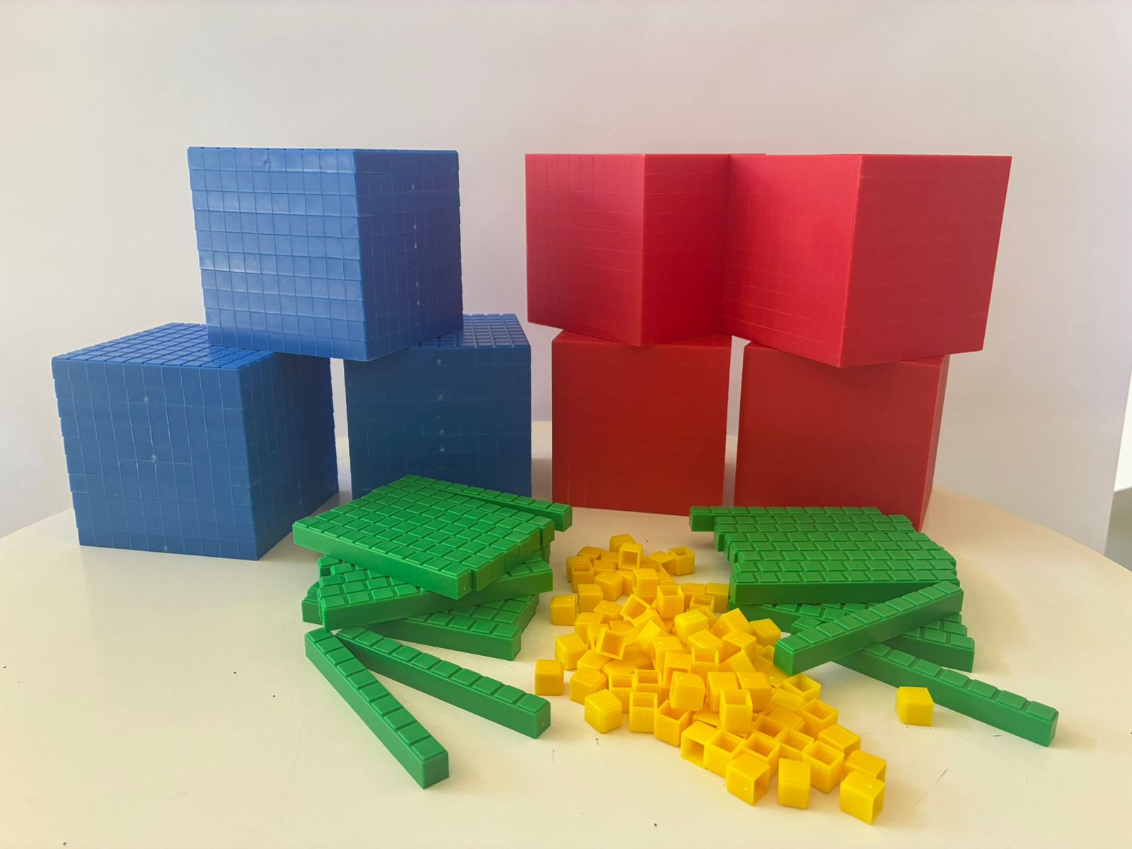 Este set de base 10 está diseñado para enseñar el sistema numérico decimal de forma concreta y visual. El material se compone de: 4 cubos de mil, 30 placas de cien, 50 barras de diez y 100 cubos de unidad, cada uno de 1 centímetro. Todas las piezas son de plástico conectable, permitiendo armar estructuras numéricas fácilmente. Las unidades, decenas y centenas se conectan entre sí, aunque el cubo de mil no es encajable. Los colores son azul, rojo, amarillo y verde, lo que facilita la identificación de cada valor. Es un recurso óptimo para trabajar en grupos de hasta 6 niños, permitiendo que cada uno manipule y comprenda las cantidades. Se entrega en una caja, perfecta para su almacenamiento y transporte. Ideal para profesores y padres que buscan una herramienta sólida y didáctica para el aprendizaje de las matemáticas.